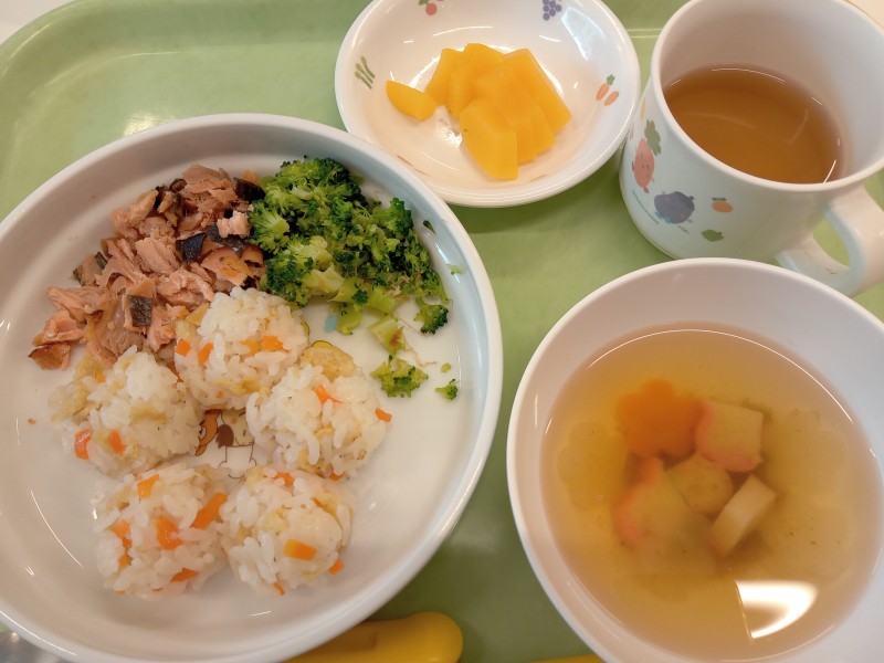 この日の給食メニューは、混ぜちらしご飯・花人参のすまし汁・さけの西京焼き・ブロッコリーのおかか和え・桃缶