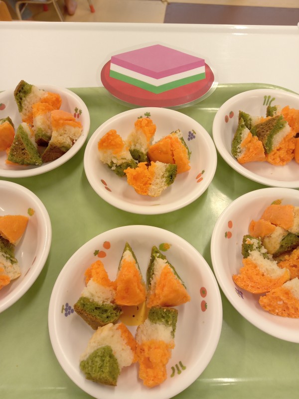 午後のおやつは菱餅にみたてた、三色ケーキでした。