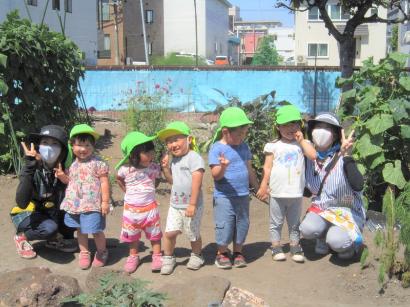 「みて~きゅうり~」「あっ!トマトもあるよ」と大興奮のこどもたち![]()