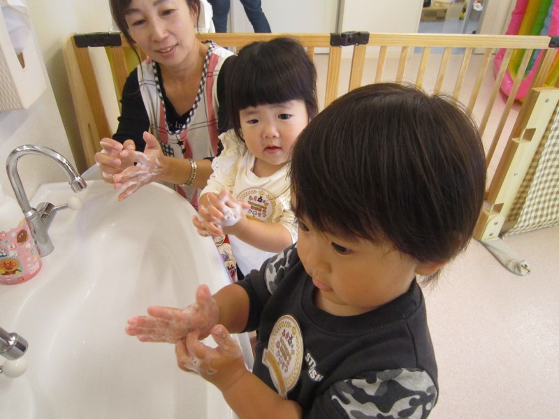 りす組は、アンパンマンの泡石鹸を使います。いつも歌っている”手洗いソング”でノリノリ🎶