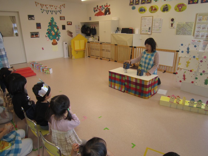 おおきなかぶをオマージュしたお話。。おおきなおもちゃ箱を開け、中から飛び出した楽器を演奏したり、その準備体操をする楽しい劇あそび![]()