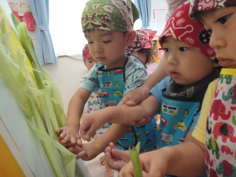 とうもろこしの皮むきに挑戦しました
