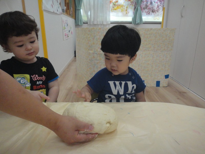 イベント 日付:2019.08.30 小麦粉粘土遊びを楽しみました‼ 本日小麦粉粘土遊びを行いました。先生が一生懸命粉から粘土に仕上げる姿を見ていた子ども達から、自然と「がんばれ~がんばれ~」と応援する声が‥‥‼なんと素敵な光景なんでしょう~ 出来上がった小麦粉粘土をワクワクしながらこねたり、のばしたりしながら遊びました‼電話や動物に見立てて遊んでいた子も多かったですよ☆