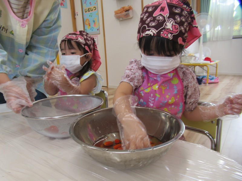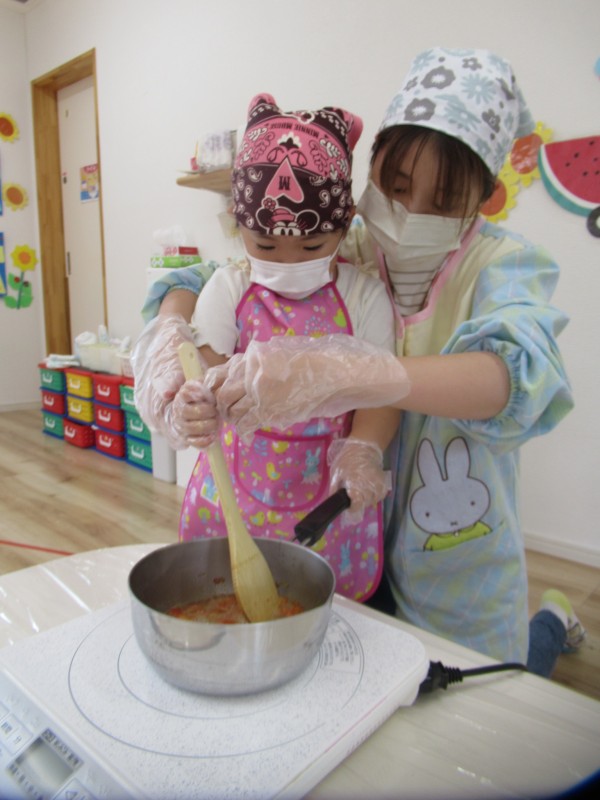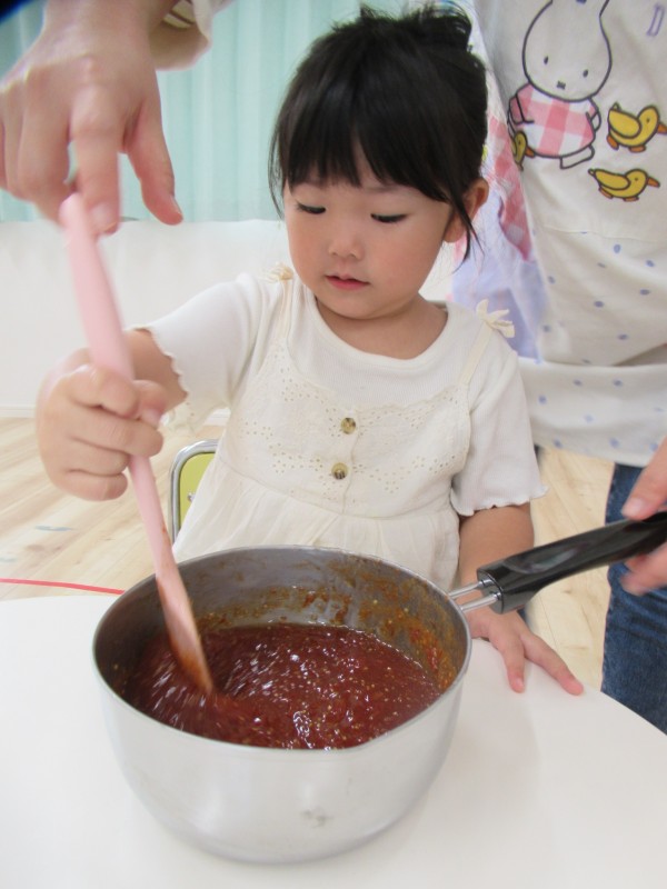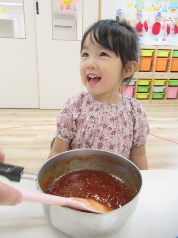 2歳児クラスのお友だちの「トマトジャムサンド作り」のクッキングの様子をお伝え致します‼