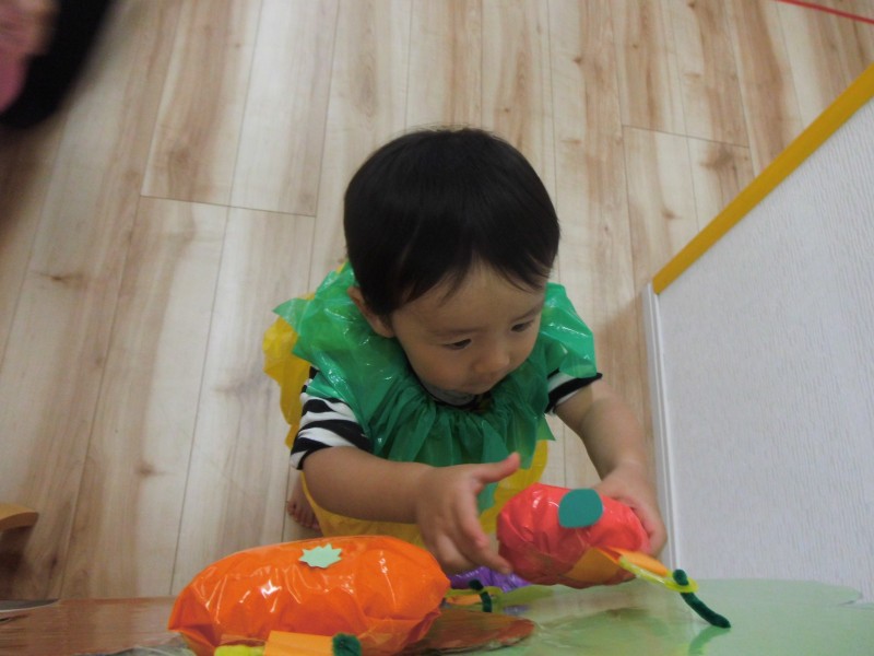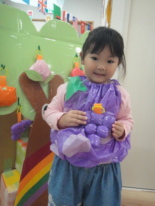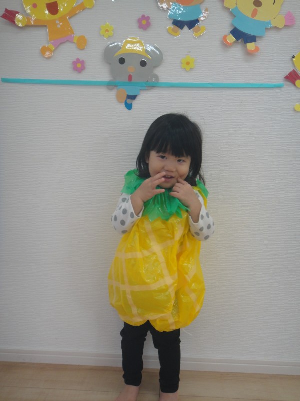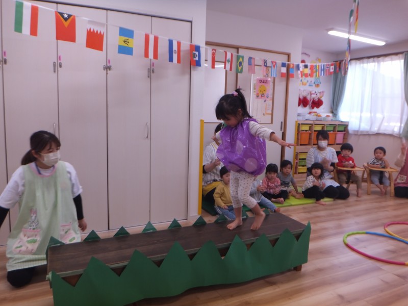 ダンス「フルーツ・フルーツ」や果物狩り、トンネルくぐりに平均台の1本橋渡り、フラフープジャンプ、ゴミ拾いゲーム(紙・プラ・