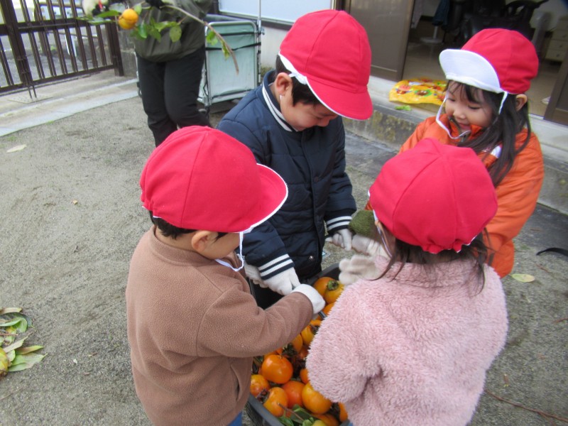 柿とりに行けなかった園児は、柿に触れたり、実際に剥く様子を観察したりと楽しみました。