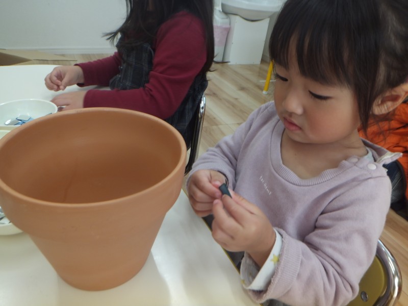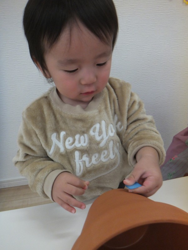 2歳児クラスのお友だちは、ひも結びに初挑戦。