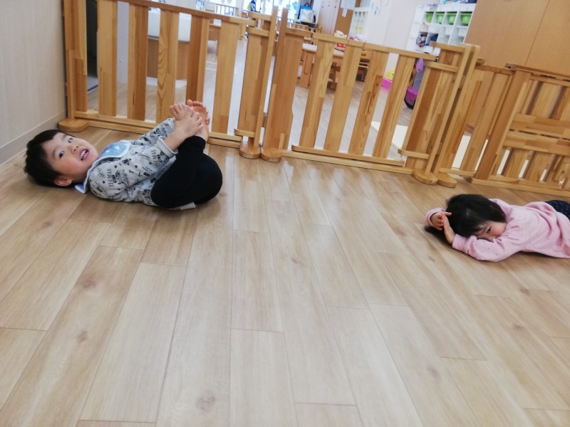他にも、歌「どんぐり」に合わせて、床に寝転びクルクル回ったり、うさぎやきりんやカエルなどなど、いろんな動物に変身もしました✨