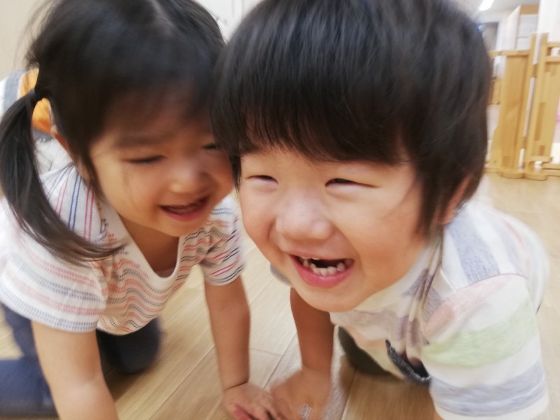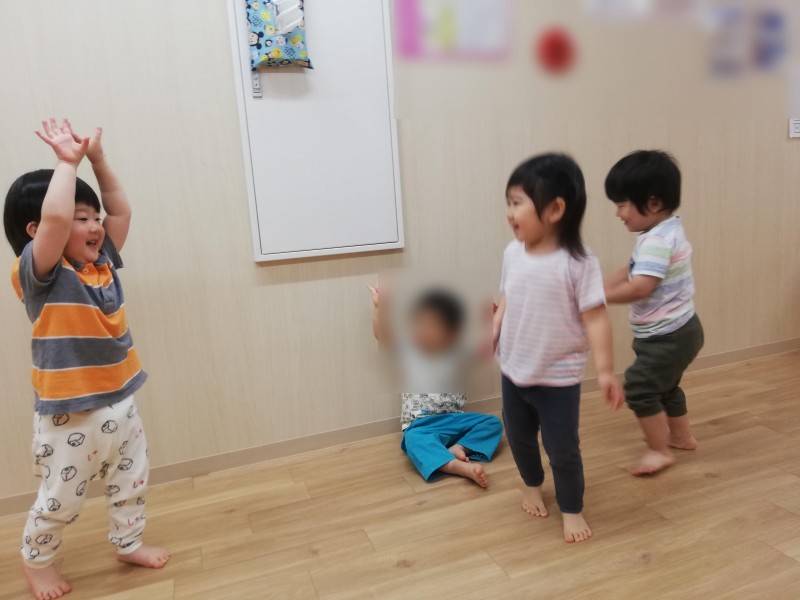 次は、保育士が腕をあげながら鳴らし、音を鳴らすのを止めたら、みんなも止めるという真似っこ遊びをしました!最初はゆっくりのスピードで鳴らしますが、スピードをあげていくと、大喜びで、大爆笑の子ども達でした😊
