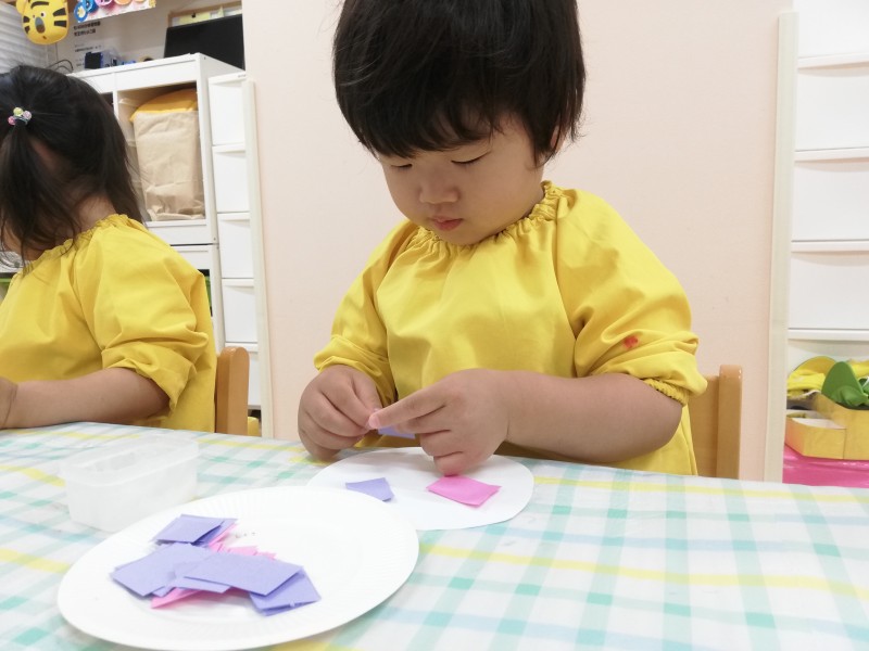 お次は、ハサミで1回切りした画用紙を、のりで貼っていき、あじさいを作りました✨