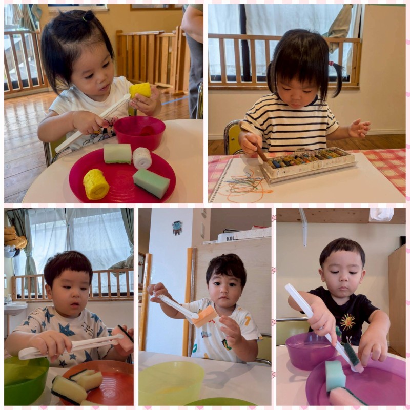トングを使って物を挟む動作は難しく持ち方や指先の強弱を知らせながら挑戦中です🍎