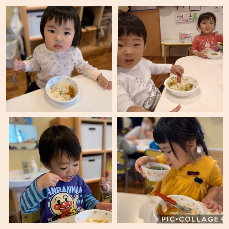 食べる事が大好きはひよこ組。最近では手掴みで食べるようになりましたよ。
