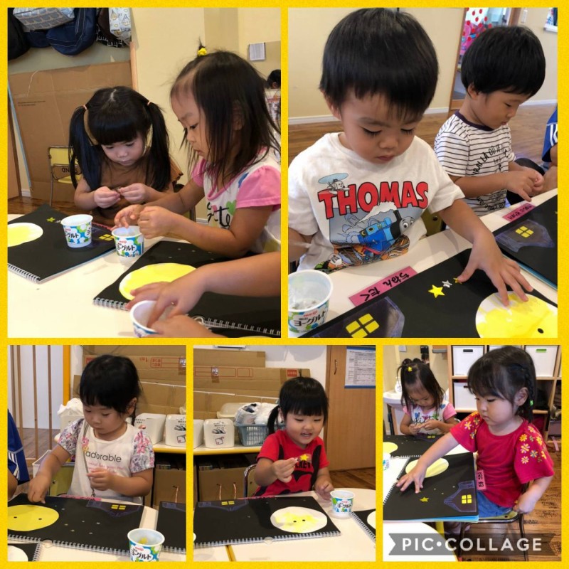 「おつきさまこんばんわ」の絵本をイメージしてお月見製作をしました♪