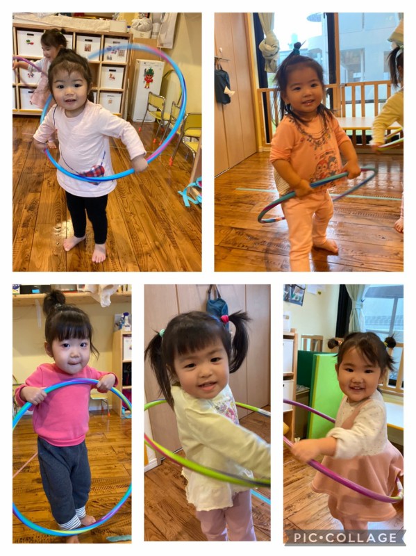 片付けの前に一つずつフラフープを渡してみるとこの表情❤とっても嬉しそう(≧▽≦)保育者が腰でまわしてみると一生懸命真似していましたよ!