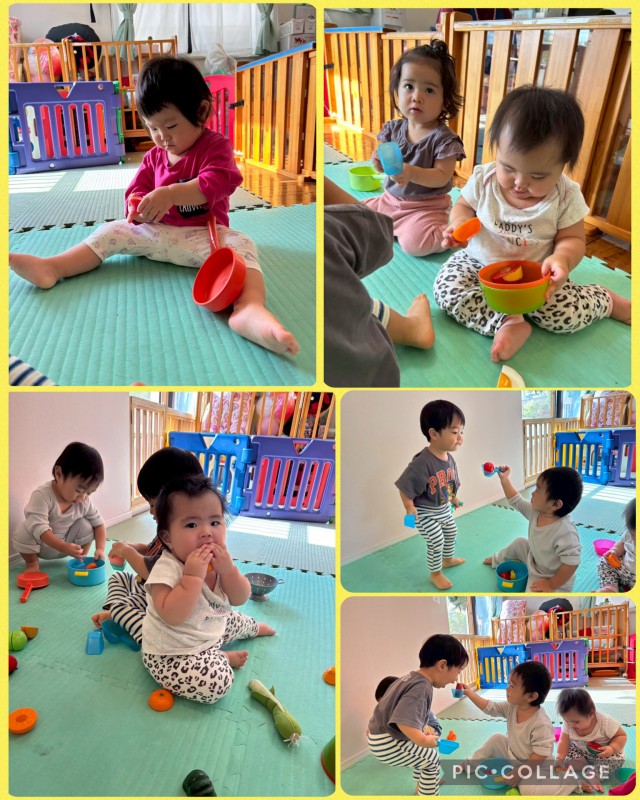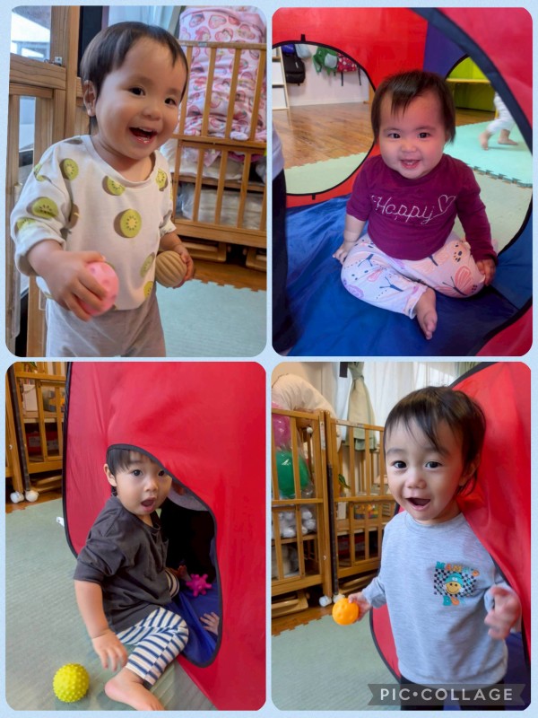 ボールを転がし合ったり、テントから「ばぁ~!」と出てきたりと友達同士でのやり取りがとても可愛いです![]()