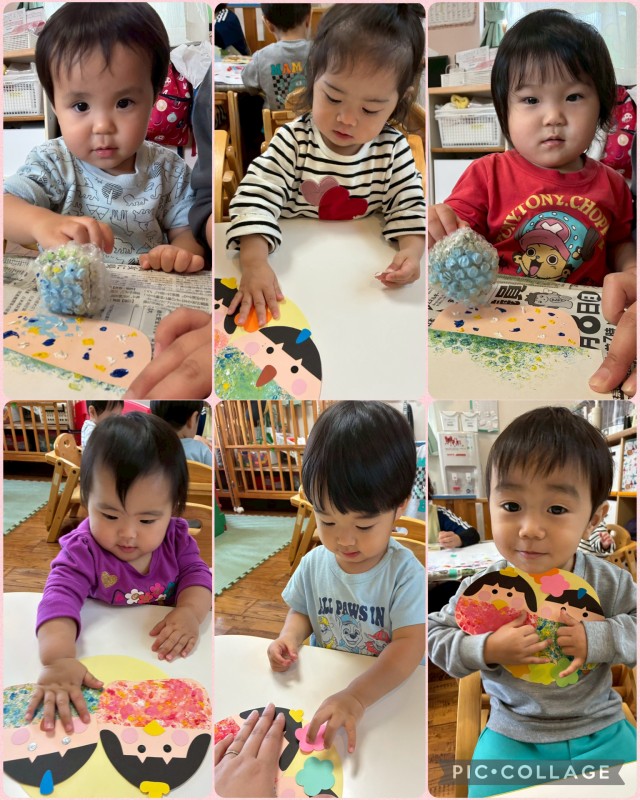 プチプチのスタンプをして、最後にお花をペッタン🌸可愛いおひなさまとおだいりさまに仕上がりました![]()
