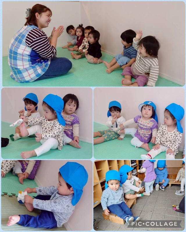 また、身の回りの事にも興味を持ち始め、靴下や靴の着脱もやってみようとする姿が見られるようになりました![]()