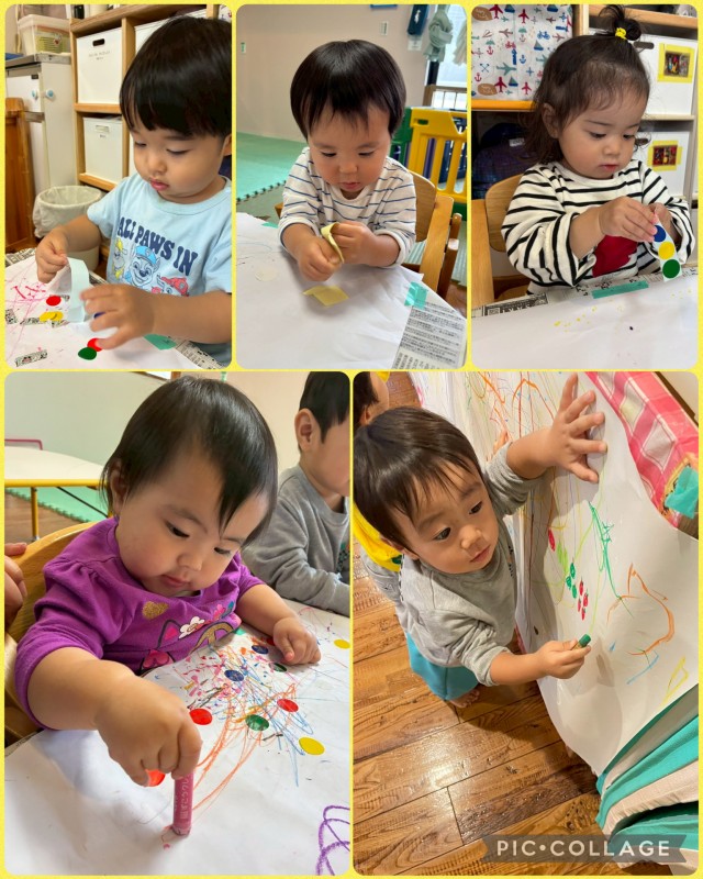 指先が器用になり、お絵描きやシール貼り遊びを集中して遊ぶ様子が見られます(^^)お絵描きや遊びの中で、色も少しずつ覚えてきているので凄いなぁ~と驚きです![]()
